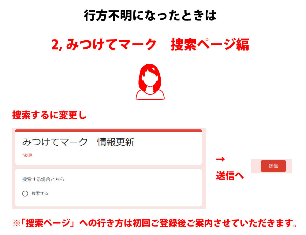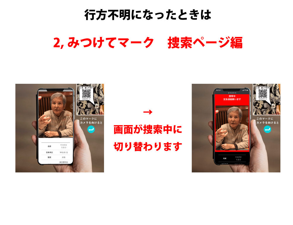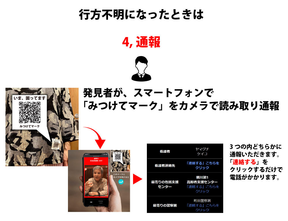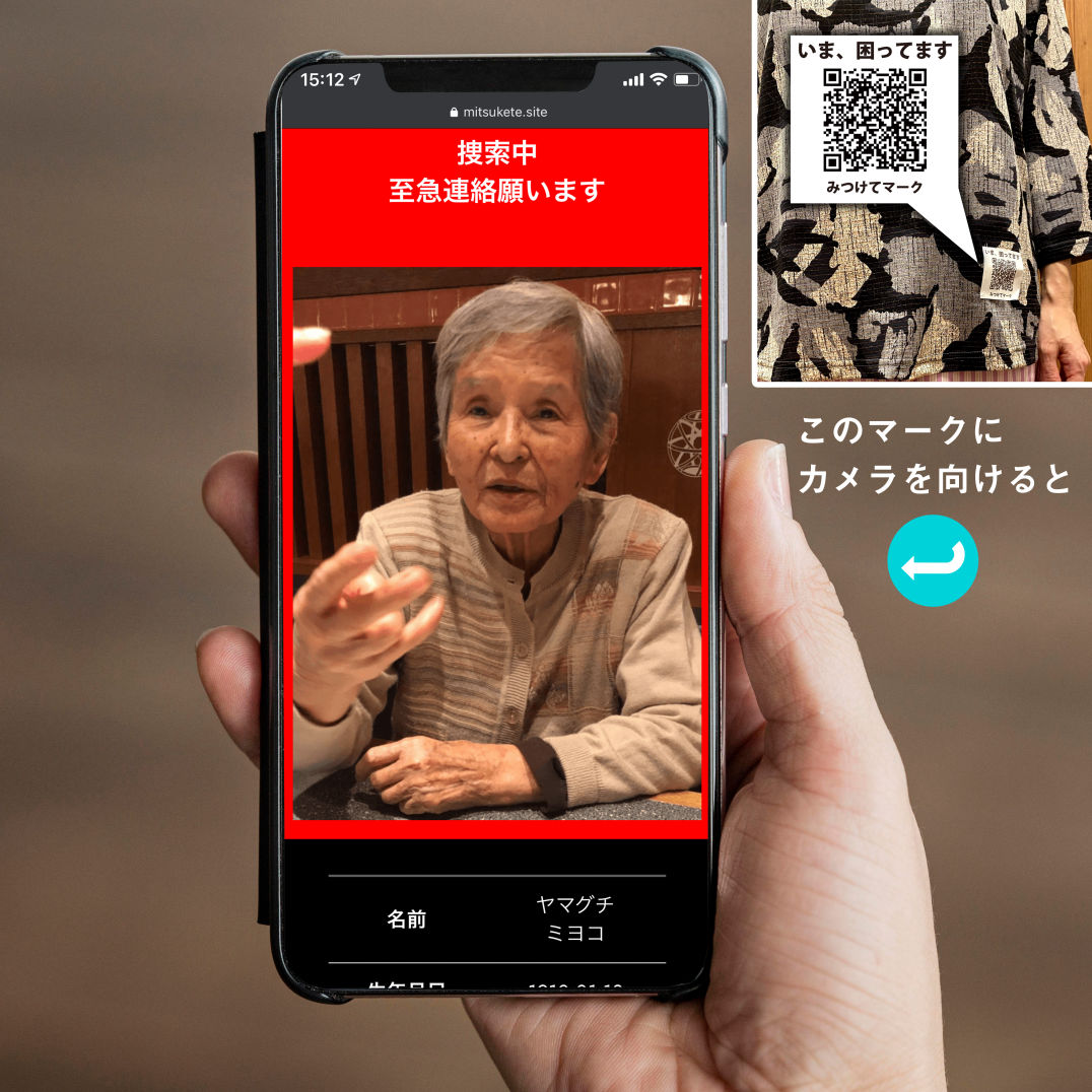 この「みつけてねマーク」は簡単に携帯のカメラで読み取るだけで、誰にも声をかけず誰にも分からず通報や現在捜索中なのかが確認や行動に移すことができます。