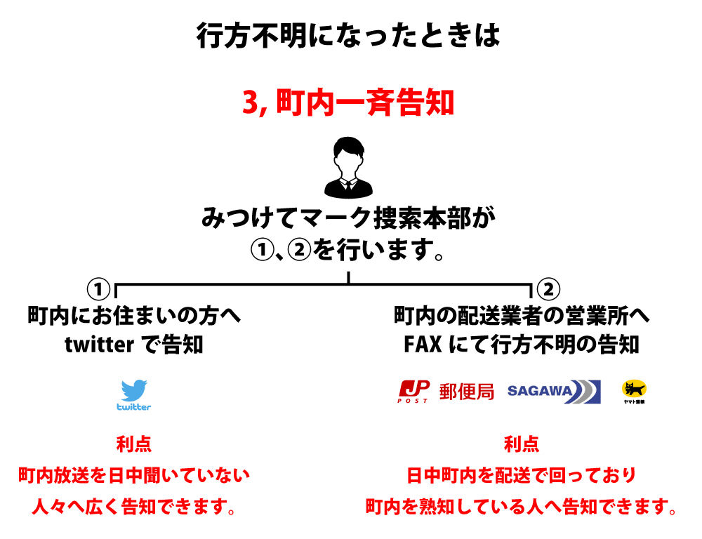 twitterやFAXDMを駆使し、町内全員が捜索中という事がわかるようにできる。